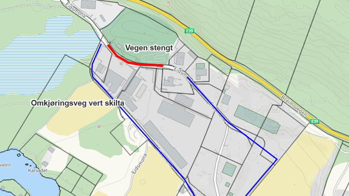 Kommunal veg i Eidsmona vert stengt ei periode Ein del av den kommunale vegen i Eidsmona vert stengt ein periode framover. Dette gjeld frå 13. januar til ca 01. mars 2026. Omkøyringsveg vert skilta...