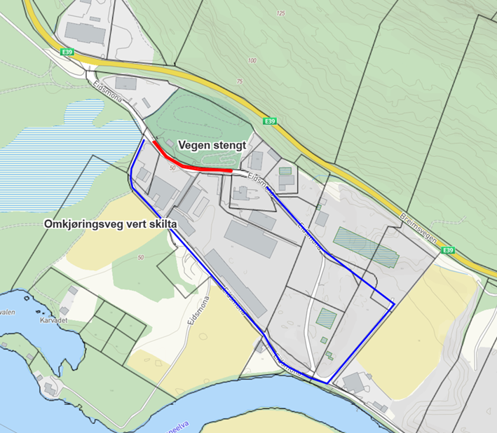 Kommunal veg i Eidsmona vert stengt ei periodeEin del av den kommunale vegen i Eidsmona vert stengt ein periode framover. Dette gjeld frå 13. januar til ca 01. mars 2026. Omkøyringsveg vert skilta. Publisert 13.01.2026 10.36