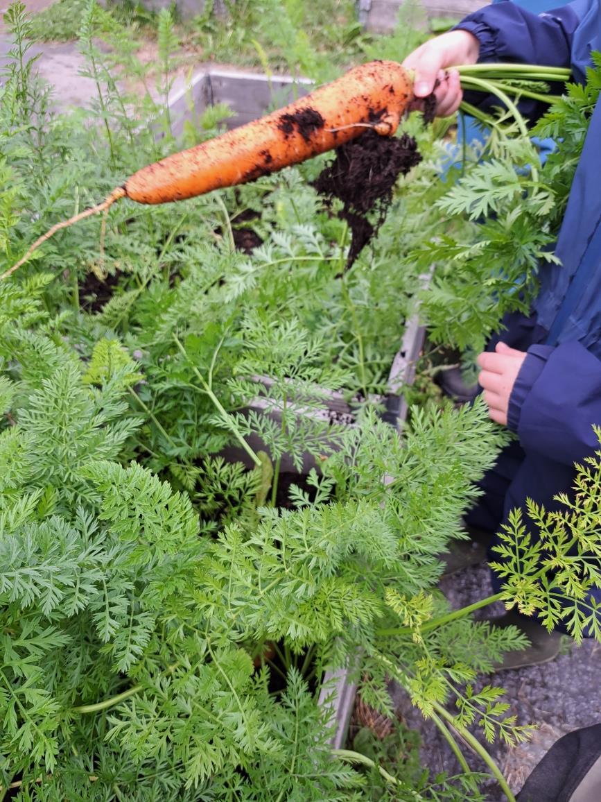 I april kom Breim bygdekvinnelag, og var med på å så gulerøtter med meir på Go`flekkjen i barnehagen. Dette som del av prosjekt “Nøysam” , som bygdekvinnelaget jobbar med. No er tida koma for å hauste desse gulerøttene. Det vart ei riktig så fin avling, og smakte kjempegodt!