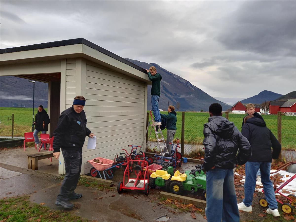 Ungdomar på arbeidslivsfag ved Gloppen ungdomskule, har teke på seg oppdrag med å bygge leikeskur på Go`flekkjen i Breim barnehage. Dei starta oppdraget med å ta mål, vurdere vinklar og materialval denne veka. I løpet av våren 2026 er det forhåpentligvis på plass. Vi gler oss!