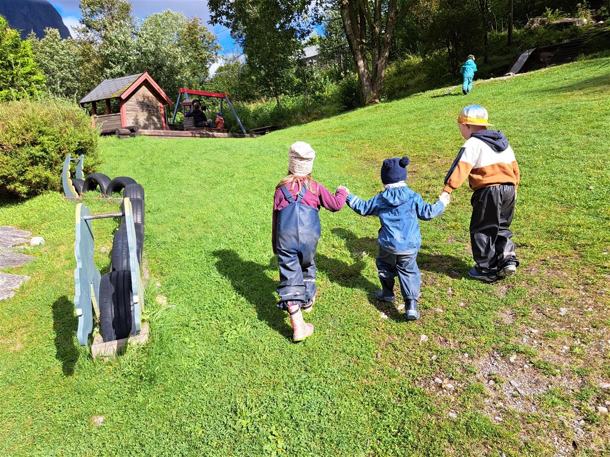 “Hei Johan!” Den største guten i barnehagen kjem bort for å seie hei. “Vil du vere med opp i skogen? Det er fint å gå der. Eg kan holde handa di.” Johan lyser opp. Det er ein skog i barnehagen. Øvst oppe, bak alle sklier og leikeapparat går det ei trapp opp til ein liten sti i skogen. Det er ulent terreng der, så det er fint å ha ei hand å halde i for dei små.