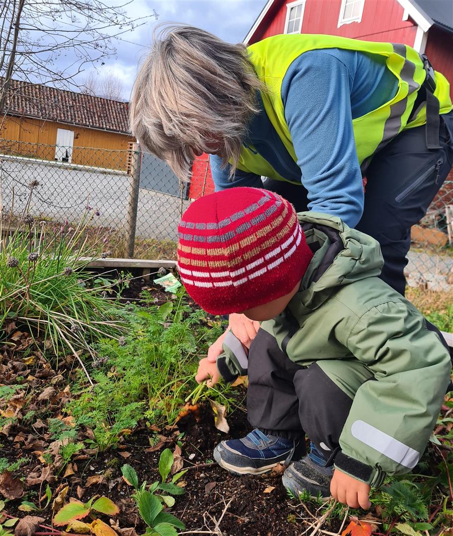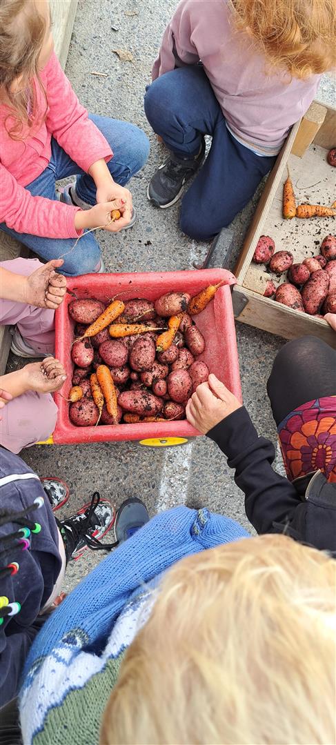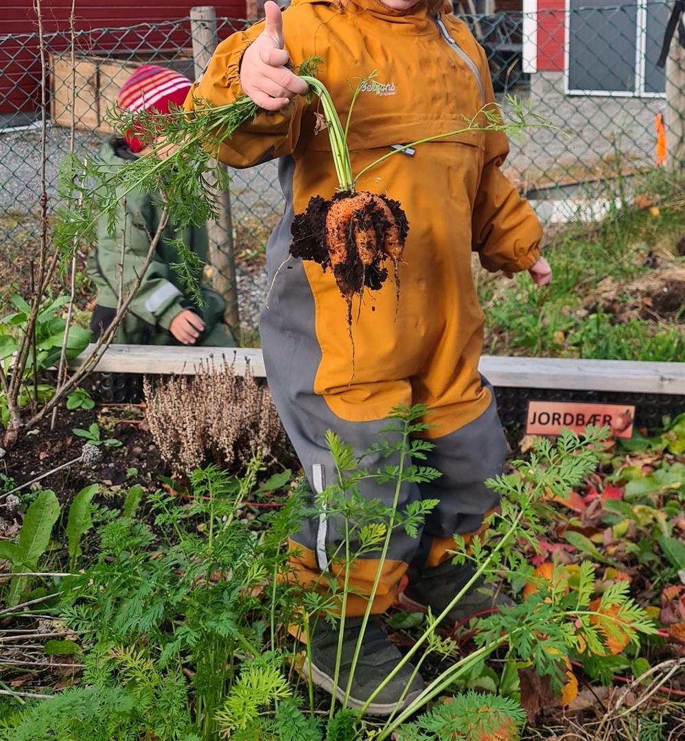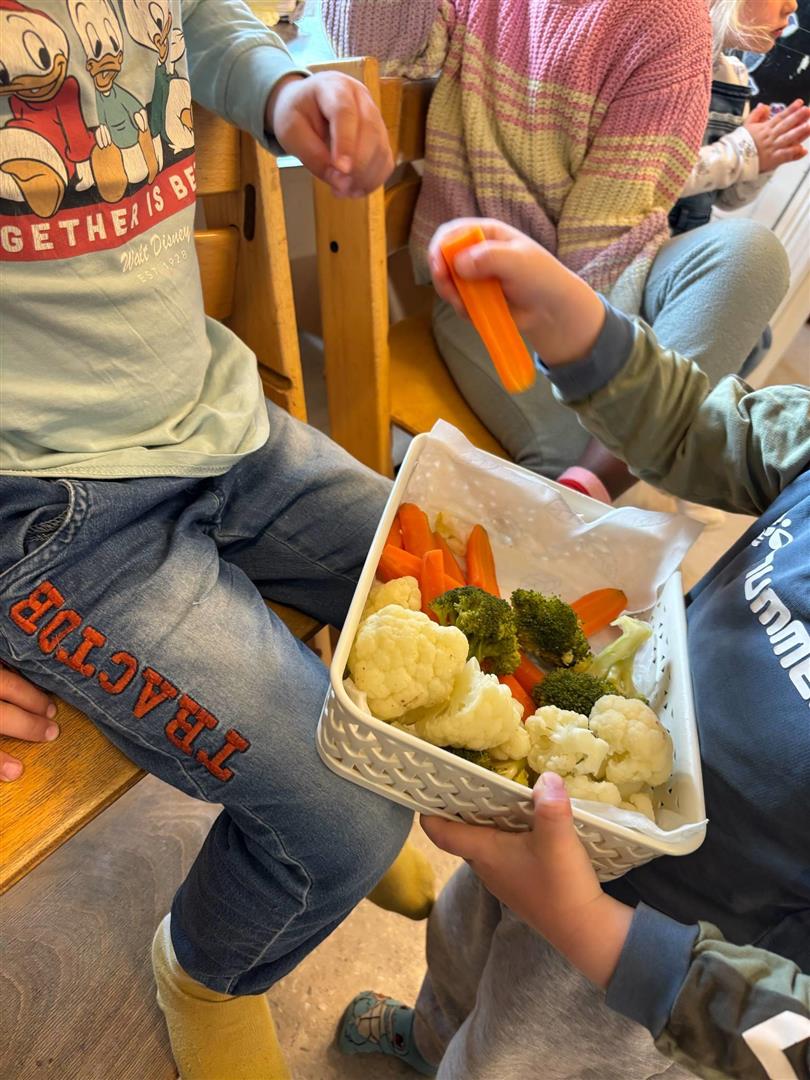 Smørjemåltid og gode matvanarGjennom gode matvanar vil vi skape sunne haldningar saman med barna. Vi er bevisst på å la barna delta i førebuing av mat og måltid, få smake ulike typar mat, skape ei god atmosfære kring måltidet og ha fokus på gode vanar knytt til både måltid og maten vi et. Vi tilbyr barna smørjemåltid med brød og variert pålegg, frukt og grønt og varm mat. Vi har kjøkkenhagar der vi sår grønnsaker og har bærplantar, og kan forsyne oss direkte derfrå når tida er inne.To gangar i veka får vi levert ferske grovbrød frå Vereide Bakeri As.Vi er opptatt av å handle kortreist og lokalt, så i sesongen kjøper vi epler frå Tystad fruktgard, gulrøter og blåbær frå Bakketun og egg på Hjelle hønseri. Publisert 12.09.2025 08.21